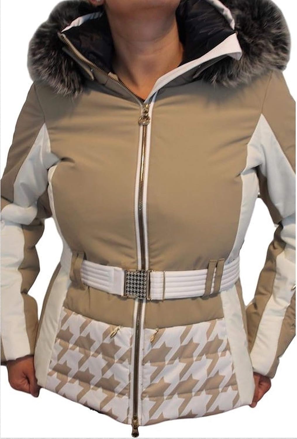 Cette veste de ski est disponible en taille 42 et dans la couleur Crockery, un mélange subtil de beige et de blanc. Le matériau principal est de la fourrure naturelle, garantissant chaleur et respirabilité. Conçue pour la saison hiver, elle convient parfaitement aux températures froides des stations de ski.